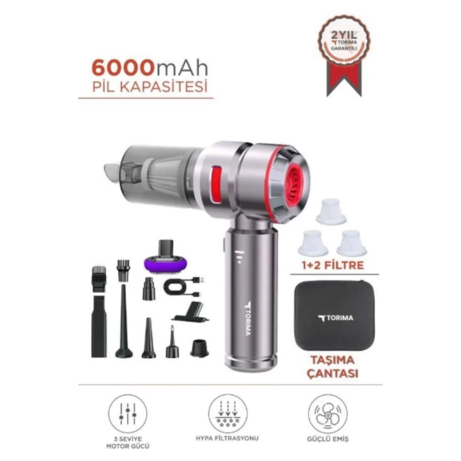Torima HL121 Üflemeli Şarjlı Araç Mini EL Süpürgesi 16.000PA Emiş Güçlü 4İN1 Araba Süpürgesi